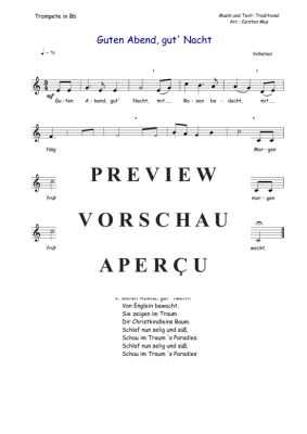 Guten Abend, gut´ Nacht ist ein beliebtes Volkslied und für den fortgeschrittenen Trompeter bestens geeignet. Dazu 2 Liedstrophen. (C - Dur)