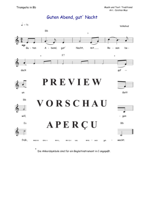 Guten Abend gut ´ Nacht ist schönes Volkslied für Trompete in B. Für den leicht fortgeschrittenen Trompeter als Solo oder Vortragsstück bestens geeignet. Dazu die Akkordsymbole für ein Begleitinstrument in C und eine Liedstrophe zum Mitsingen in C-Dur.