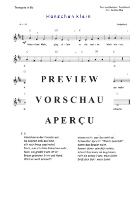 Hänschen Klein ist ein beliebtes Kinderlied. Für den leicht fortgeschrittenen Trompeter. Als Übungs- oder Vortragsstück in D - Dur mit 3 Liedstrophen bestens geeignet. Dazu die Akkordsymbole für ein Begleitinstrument in C.