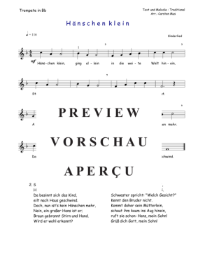 Hänschen Klein ist ein beliebtes Kinderlied. Für den fortgeschrittenen Trompeter. Als Übungs- oder Vortragsstück in F - Dur mit 3 Liedstrophen bestens geeignet.
