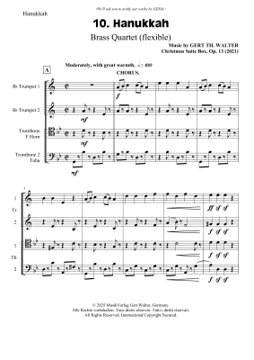 Sie suchen noch originelle Weihnachtsmusik für Ihr Blechbläserquartett? Los geht´s! Partitur und Stimmen. © 2025 MusikVerlag Gert Walter, Germany. Viel Spaß! So erleben Kinder und Erwachsene in den USA traditionell die Weihnachtszeit: "Hanukkah" ist der zehnte Titel aus der Sammlung "Candy ´n Cake. The Christmas Suite Box". 1. Candy ´n Cake / 2. Trick Or Treat! / 3. The President´s Turkey-Pardon / 4. Thanksgiving Day / 5. Turkey´s Wishbone / 6. Black Friday / 7. National Christmas Tree / 8. Dyker Heights / 9. Pyjamas - We Are Family / 10. Hanukkah / 11. Stockings / 12. A Visit From St. Nicholas / 13. Santa Was Here! Wake Up! / 14. Mistletoe / 15. Yule Log / 16. Nothing Goes Out / 17. New Year´s Eve / 18. New Year´s Hymn.