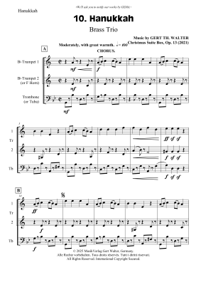 Sie suchen noch originelle Weihnachtsmusik für Ihr Blechbläsertrio? Los geht´s! Partitur und Stimmen. © 2025 MusikVerlag Gert Walter, Germany. Viel Spaß! So erleben Kinder und Erwachsene in den USA traditionell die Weihnachtszeit: "Hanukkah" ist der zehnte Titel aus der Sammlung "Candy ´n Cake. The Christmas Suite Box". 1. Candy ´n Cake / 2. Trick Or Treat! / 3. The President´s Turkey-Pardon / 4. Thanksgiving Day / 5. Turkey´s Wishbone / 6. Black Friday / 7. National Christmas Tree / 8. Dyker Heights / 9. Pyjamas - We Are Family / 10. Hanukkah / 11. Stockings / 12. A Visit From St. Nicholas / 13. Santa Was Here! Wake Up! / 14. Mistletoe / 15. Yule Log / 16. Nothing Goes Out / 17. New Year´s Eve / 18. New Year´s Hymn.