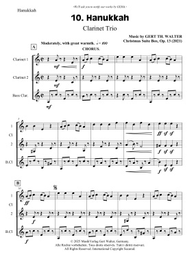 Sie suchen noch originelle Weihnachtsmusik für Ihr Klarinettentrio? Los geht´s! Partitur und Stimmen. © 2025 MusikVerlag Gert Walter, Germany. Viel Spaß! So erleben Kinder und Erwachsene in den USA traditionell die Weihnachtszeit: "Hanukkah" ist der zehnte Titel aus der Sammlung "Candy ´n Cake. The Christmas Suite Box". 1. Candy ´n Cake / 2. Trick Or Treat! / 3. The President´s Turkey-Pardon / 4. Thanksgiving Day / 5. Turkey´s Wishbone / 6. Black Friday / 7. National Christmas Tree / 8. Dyker Heights / 9. Pyjamas - We Are Family / 10. Hanukkah / 11. Stockings / 12. A Visit From St. Nicholas / 13. Santa Was Here! Wake Up! / 14. Mistletoe / 15. Yule Log / 16. Nothing Goes Out / 17. New Year´s Eve / 18. New Year´s Hymn.