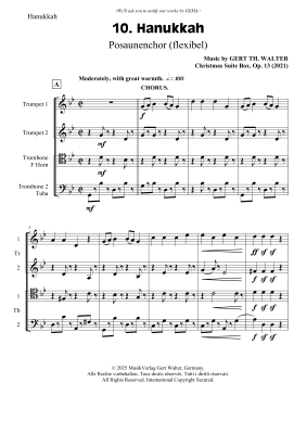 Sie suchen noch originelle Weihnachtsmusik für Ihren Posaunenchor? Los geht´s! Partitur und Stimmen. © 2025 MusikVerlag Gert Walter, Germany. Viel Spaß! So erleben Kinder und Erwachsene in den USA traditionell die Weihnachtszeit: "Hanukkah" ist der zehnte Titel aus der Sammlung "Candy ´n Cake. The Christmas Suite Box". 1. Candy ´n Cake / 2. Trick Or Treat! / 3. The President´s Turkey-Pardon / 4. Thanksgiving Day / 5. Turkey´s Wishbone / 6. Black Friday / 7. National Christmas Tree / 8. Dyker Heights / 9. Pyjamas - We Are Family / 10. Hanukkah / 11. Stockings / 12. A Visit From St. Nicholas / 13. Santa Was Here! Wake Up! / 14. Mistletoe / 15. Yule Log / 16. Nothing Goes Out / 17. New Year´s Eve / 18. New Year´s Hymn.