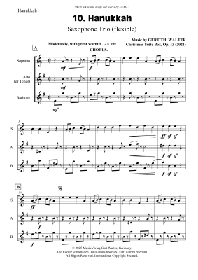Sie suchen noch originelle Weihnachtsmusik für Ihr Saxofontrio? Los geht´s! Partitur und Stimmen. © 2025 MusikVerlag Gert Walter, Germany. Viel Spaß! So erleben Kinder und Erwachsene in den USA traditionell die Weihnachtszeit: "Hanukkah" ist der zehnte Titel aus der Sammlung "Candy ´n Cake. The Christmas Suite Box". 1. Candy ´n Cake / 2. Trick Or Treat! / 3. The President´s Turkey-Pardon / 4. Thanksgiving Day / 5. Turkey´s Wishbone / 6. Black Friday / 7. National Christmas Tree / 8. Dyker Heights / 9. Pyjamas - We Are Family / 10. Hanukkah / 11. Stockings / 12. A Visit From St. Nicholas / 13. Santa Was Here! Wake Up! / 14. Mistletoe / 15. Yule Log / 16. Nothing Goes Out / 17. New Year´s Eve / 18. New Year´s Hymn.