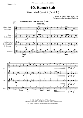 Sie suchen noch originelle Weihnachtsmusik für Ihr Holzbläserquartett? Los geht´s! Partitur und Stimmen. © 2025 MusikVerlag Gert Walter, Germany. Viel Spaß! So erleben Kinder und Erwachsene in den USA traditionell die Weihnachtszeit: "Hanukkah" ist der zehnte Titel aus der Sammlung "Candy ´n Cake. The Christmas Suite Box". 1. Candy ´n Cake / 2. Trick Or Treat! / 3. The President´s Turkey-Pardon / 4. Thanksgiving Day / 5. Turkey´s Wishbone / 6. Black Friday / 7. National Christmas Tree / 8. Dyker Heights / 9. Pyjamas - We Are Family / 10. Hanukkah / 11. Stockings / 12. A Visit From St. Nicholas / 13. Santa Was Here! Wake Up! / 14. Mistletoe / 15. Yule Log / 16. Nothing Goes Out / 17. New Year´s Eve / 18. New Year´s Hymn.
