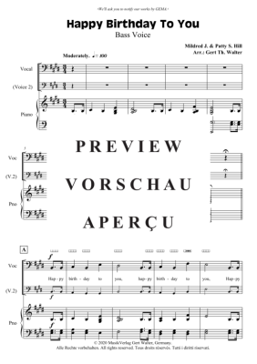 Happy Birthday To You - Noten für Gesang 2x Bass + Klavier Mildred Hill/Patty Hill