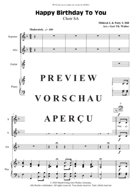 Happy Birthday To You - Noten für Frauenchor + Klavier, Gitarre Mildred Hill/Patty Hill
