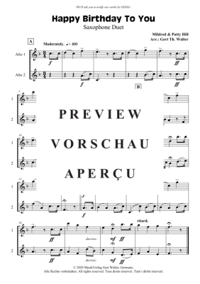 Happy Birthday To You - Noten für Saxophon Duett AA/TT Mildred Hill/Patty Hill