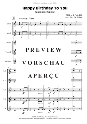 Happy Birthday To You - Noten für Saxophon Quintett AATTB Mildred Hill/Patty Hill