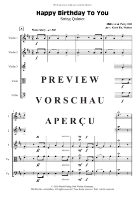 Happy Birthday To You - Noten für Streicherquintett 3x Violine, Viola + Cello Mildred Hill/Patty Hill