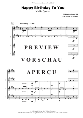 Happy Birthday To You - Noten für Violinenquartett Mildred Hill/Patty Hill