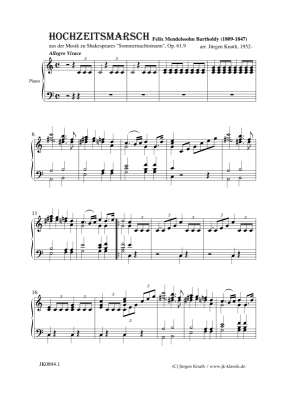 Hochzeitsmarsch - Noten für Klavier Solo Felix Mendelssohn Bartholdy