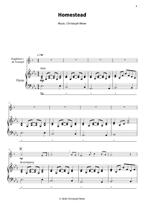 "Homestead" by Christoph Meier is a calm, open-hearted piece for flugelhorn and piano that sits naturally in Eb major and moves in an easy 4/4. The lines sing without forcing the sound, and the piano part supports you with clear harmony and a steady pulse, so rehearsals stay focused and musical.