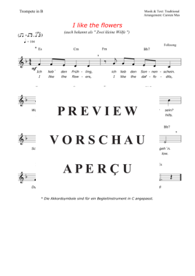 I like the flowers, auch bekannt als " Zwei kleine Wölfe" ist ein beliebter Folksong mit einer Liedstrophe in deutsch und in englisch. Das ist Lied ist für den leicht fortgeschrittenen bestens geeignet und soll im Easy - Swing gespielt werden (F-Dur). Dazu Atemzeichen, Tempoangabe, und die Akkordsymbole für ein Begleitinstrument in C.