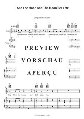 Dieses Notenheft enthält die Originalnoten zum Kinderlied "I See The Moon And The Moon Sees Me" für Klavier, Gesang und Gitarre. Für Anfänger arrangiert in C-Dur mit Liedtext.