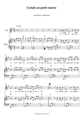 Dieses Werk enthält die Originalnoten des beliebten französischen Kinderlieds "Il etait un petit navire", einfach arrangiert in G-Dur für Klavier und Gesang.