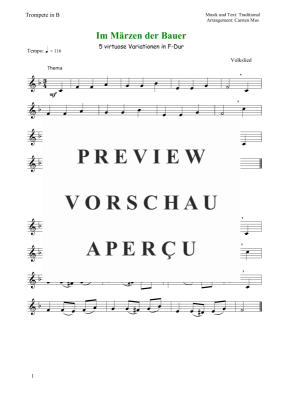 Das Lied "Im Märzen der Bauer" ist ein Volkslied. Es gehört zur traditionellen deutschen Volksmusik und beschreibt die landwirtschaftlichen Tätigkeiten im Frühling. Mit 5 virtuosen Variationen mit verschiedenen Bindungen, Einfach-Zungenstoß und Doppel und Triolenzunge. Geeignet für B-Trompete, Flügelhorn, Kornett, Bariton und Tenorhorn. Für Anfänger und Fortgeschritte als Übungs oder Vortragsstück bestens geeignet. Mit Tempoangabe, Lautstärkezeichen und Atemzeichen in F-Dur.