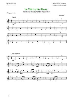 Das Lied "Im Märzen der Bauer" ist ein Volkslied. Es gehört zur traditionellen deutschen Volksmusik und beschreibt die landwirtschaftlichen Tätigkeiten im Frühling. Mit 5 Virtuosen Variationen mit verschiedenen Bindungen, Einfach-Zungenstoß und Doppel und Triolenzunge, einfacher und doppelter Vorschag. Geeignet für Blechbläser die ein Blasinstrument wie B-Trompete, Flügelhorn, Kornett, Bariton oder Tenorhorn spielen. Für den fortgeschrittenen Bläser als Übungs oder Vortragsstück bestens geeignet. Das Thema "Im Märzen der Bauer" beginnt in F-Dur. Jede weitere Variation ist dann in einer anderen gesteigerten Tonart notiert (in F - G - As - A - Bb - C - Dur). Dazu gibt es noch die Tempoangabe, Lautstärkezeichen und die Atemzeichen.