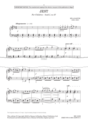 Jest (from For Children - Book I, No. 27) - Noten für Klavier Bela Bartok