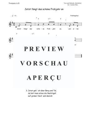 Das Lied, Jetzt fängt das schöne Frühjahr an, ist ein Frühlingslied das inhaltlich den Beginn des Frühlings beschreibt und häufig im Kindergarten oder in der Grundschule gesungen wird. Eine mittelleichte Version für den leicht fortgeschrittenen Trompeter in B. Angegeben sind die Atemzeichen, die Tempoangabe, die Tonart, das Lautstärkezeichen, die angepassten Akkordsymbole für ein Begleitinstrument in C - Stimmung, sowie 3 Liedstrophen zum Mitsingen. (G - Dur)