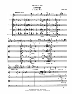 Year Of Composition: 2017 / Duration: 15´ / "Journeys" for flute and string quartet by Roger C. Vogel. The 5 movements depict moods that one can have while traveling: On the Road suggests the enthusiasm and high spirits that are found when one begins a lo