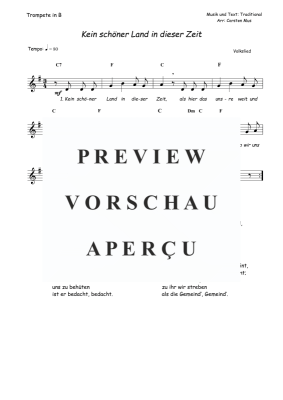 Kein schöner Land in dieser Zeit ist ein bekanntes Volkslied, das auf Anton Wilhelm von Zuccalmaglio zurückgeht und 1840 erstmals veröffentlicht wurde. Für den fortgeschrittenen Trompeter als Übungs oder Vortragsstück bestens geeignet. Dazu die Tempobezeichnung, Lautstärkezeichen, angepasste Akkordsymbole für ein Begleitinstrument in C, Atemzeichen und 5 Liedstrophen zum Mitsingen. Das Lied ist in G - Dur notiert.