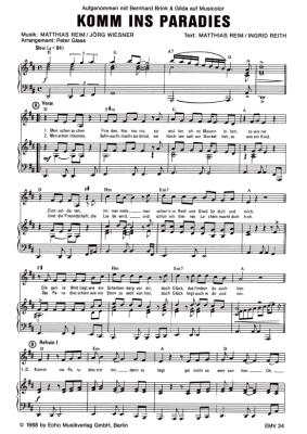 Komm ins Paradies - Noten für Klavier und Gesang Bernhard Brink & Gilda
