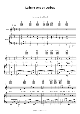 Dieses Notenheft enthält die Originalnoten zum Kinderlied "La lune vers en gerbes" für Klavier, Gesang und Gitarre. Leichter Schwierigkeitsgrad in G-Dur mit Liedtext.
