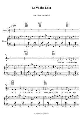 Dieses Notenheft enthält die Originalnoten zum Kinderlied "La Vache Lola" für Klavier, Gesang und Gitarre. Leichter Schwierigkeitsgrad in Es-Dur mit Liedtext.