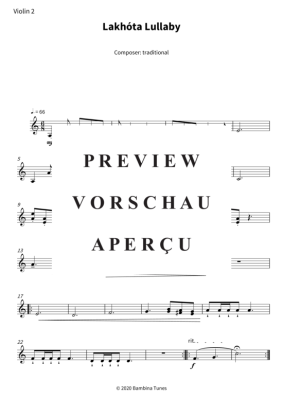 Dieses Notenbuch enthält die Stimme der Violine (II) des wunderschönen indianischen Wiegenliedes "Lakhóta Lullaby". Mittlerer Schwierigkeitsgrad in a-Moll. Ebenfalls erhältlich sind die Stimmen von Violine I, Bratsche, Cello, sowie die gesamte Partitur.