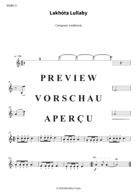 Dieses Notenbuch enthält die Stimme der Violine (I) des wunderschönen indianischen Wiegenliedes "Lakhóta Lullaby". Mittlerer Schwierigkeitsgrad in a-Moll. Ebenfalls erhältlich sind die Stimmen von Violine II, Bratsche, Cello, sowie die gesamte Partitur.