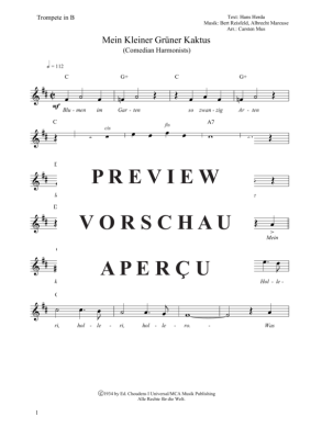 Mein Kleiner Grüner Kaktus - Comedian Harmonists ist ein populärer Schlager. Für den fortgeschrittenen Trompeter als Übungs- oder Vortragsstück gut geeignet. Das Lied ist im Alla Breve Takt , mit Tempoangabe, Halbtöne mit Versetzungszeichen sind gekennzeichnet. Dazu eine Liedstrophe und die Akkordbezeichnungen für ein Begleitinstrument in C. (D - Dur).