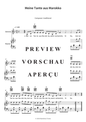Dieses Notenheft enthält die Originalnoten zum Kinderlied "Meine Tante aus Marokko" für Klavier, Gesang und Gitarre. Leichter Schwierigkeitsgrad in F-Dur mit Liedtext.