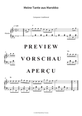 Dieses Notenheft enthält die Originalnoten zum Kinderlied "Meine Tante aus Marokko" für Klavier. Leichter Schwierigkeitsgrad in F-Dur.