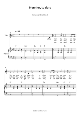 Dieses Werk enthält die Originalnoten des beliebten französischen Kinderlieds "Meunier, tu dors", einfach arrangiert in F-Dur für Klavier und Gesang.