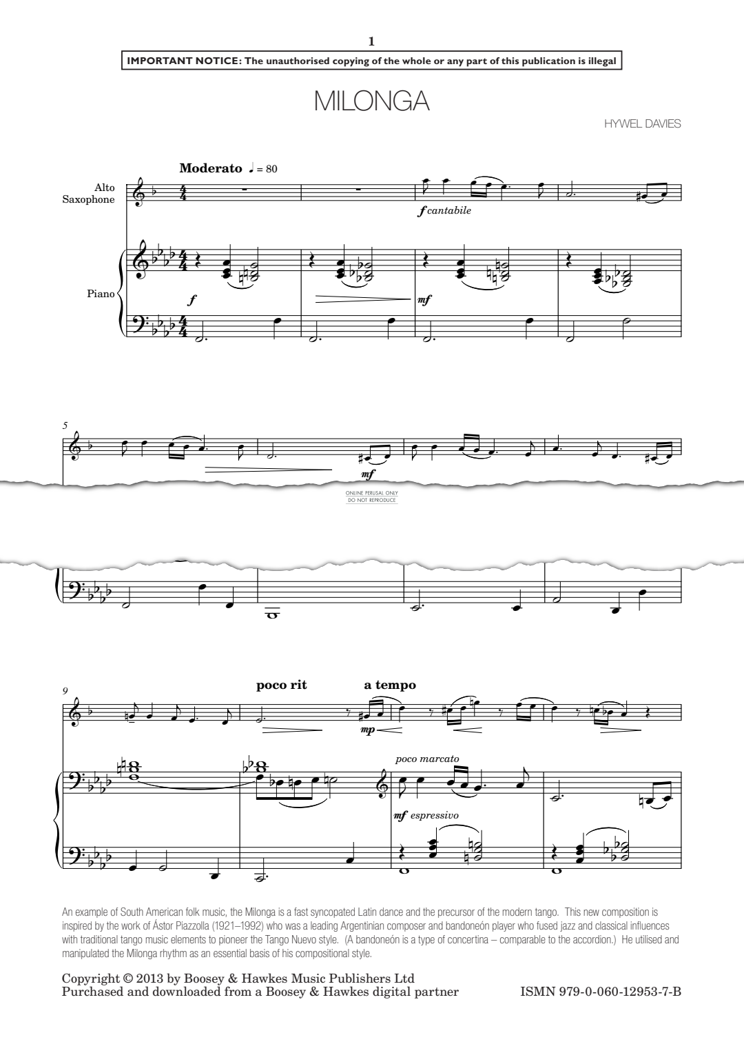 Milonga - Noten für Klavier, Saxophon Hywel Davies