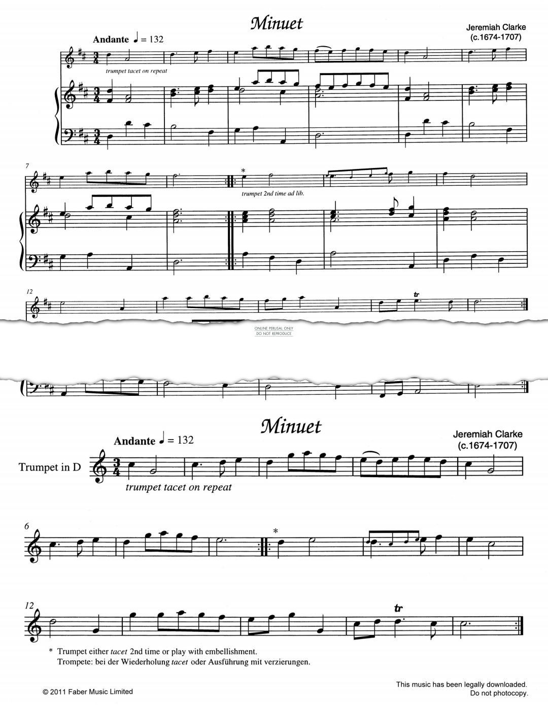 Minuet - Noten für Klavier, Trompete Jeremiah Clarke