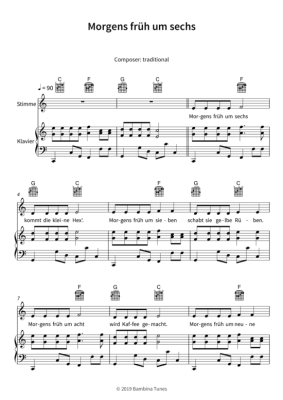 Dieses Notenheft enthält die Originalnoten zum Kinderlied "Morgens früh um sechs" für Klavier, Gesang und Gitarre. Für Anfänger arrangiert in C-Dur mit Liedtext.