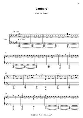 Iiro Rantala´s My Finnish Calendar is a brilliant set of twelve piano compositions by the celebrated Finnish jazz pianist. This sheet music book weaves witty jazz, lyrical melodies, and vivid seasonal imagery, perfect for advanced pianists exploring Finland´s year through solo, recital, or teaching settings. It includes "January," a wistful winter prelude, "February," evoking icy solitude, "March," hopeful with sprightly rhythms, "April," a bright spring melody, "May," airy and buoyant, "June," radiant with midsummer glow, "July," a lively ragtime jaunt, "August," rich with nostalgic warmth, "September," crisp with autumnal depth, "October," bold with colorful contrasts, "November," quirky with bluesy twists, and "December," warm with festive cheer. Ideal for honing Finnish jazz skills, Rantala´s works blend virtuosity and wit, captivating players and listeners. Dive into this Nordic treasure and bring its seasonal magic to life.