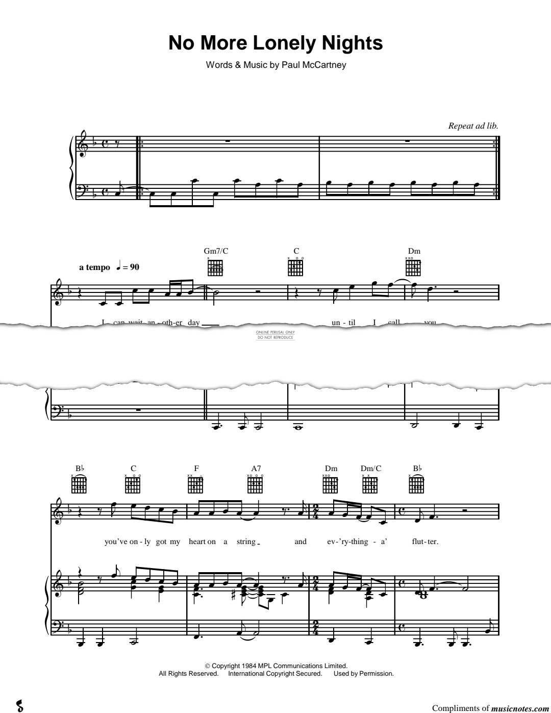 No More Lonely Nights - Noten für Gesang, Gitarre, Klavier Paul McCartney