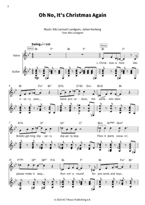 Dieses Notenheft enthält die Originalnoten von Nils Landgren zum Weihnachtslied "Oh No, It´s Christmas Again" für Trio. Die Partitur besteht aus Gesangsstimme, Posaune und Gitarrenbegleitung. Mittlerer Schwierigkeitsgrad in B-Dur mit Liedtext.