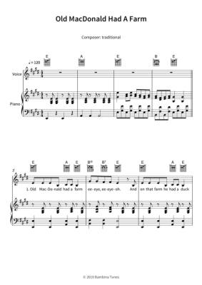 Dieses Notenheft enthält die Originalnoten zum Kinderlied "Old MacDonald Had A Farm" für Klavier, Gesang und Gitarre. Leichter Schwierigkeitsgrad in E-Dur mit Liedtext.