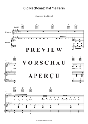 Dieses Notenheft enthält die Originalnoten zum Jazz-Song "Old MacDonald hat ´ne Farm" für Klavier, Gesang und Gitarre. Leichter Schwierigkeitsgrad in E-Dur mit Liedtext.