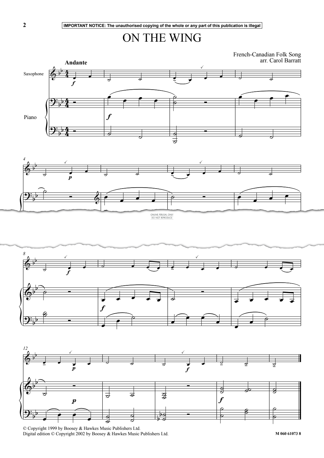 On The Wing - Noten für Klavier, Saxophon French-Canadian Folk Song