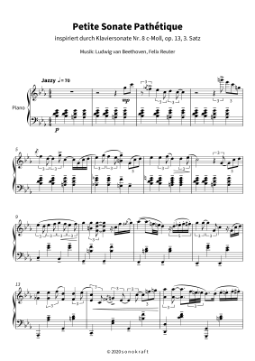 Mit künstlerischer Freiheitsliebe hat Felix Reuter zentrale Motive der Beethoven-Sonate Pathétique aufgegriffen, das Werk gefühlvoll "destilliert" und auf ganz organische Weise eigene Stilfarben hineinfließen lassen. Sie bringen die künstlerische Essenz als eine persönliche Lesart neu zum Strahlen - friedvoller und weniger aufwühlend als das ursprüngliche Werk, und doch mit großer Ausdruckskraft. Im dritten Satz schafft es Felix Reuter mit kleinen Veränderungen, geschickte Jazzharmonien entstehen zu lassen und aus dem Werk etwas ganz anderes zu machen. Das musikalische Thema verwandelt sich einen herrlich langsamen Blues. In dieser Ausgabe sind die Klaviernoten zum dritten Satz enthalten. Satz 1 und 2 sind ebenfalls als Notenausgaben erhältlich.