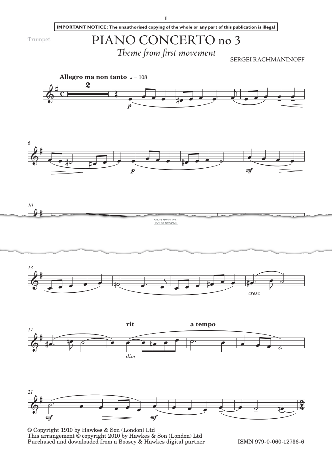 Piano Concerto No. 3 - Theme from First Movement - Noten für Klavier, Trompete Sergei Rachmaninoff