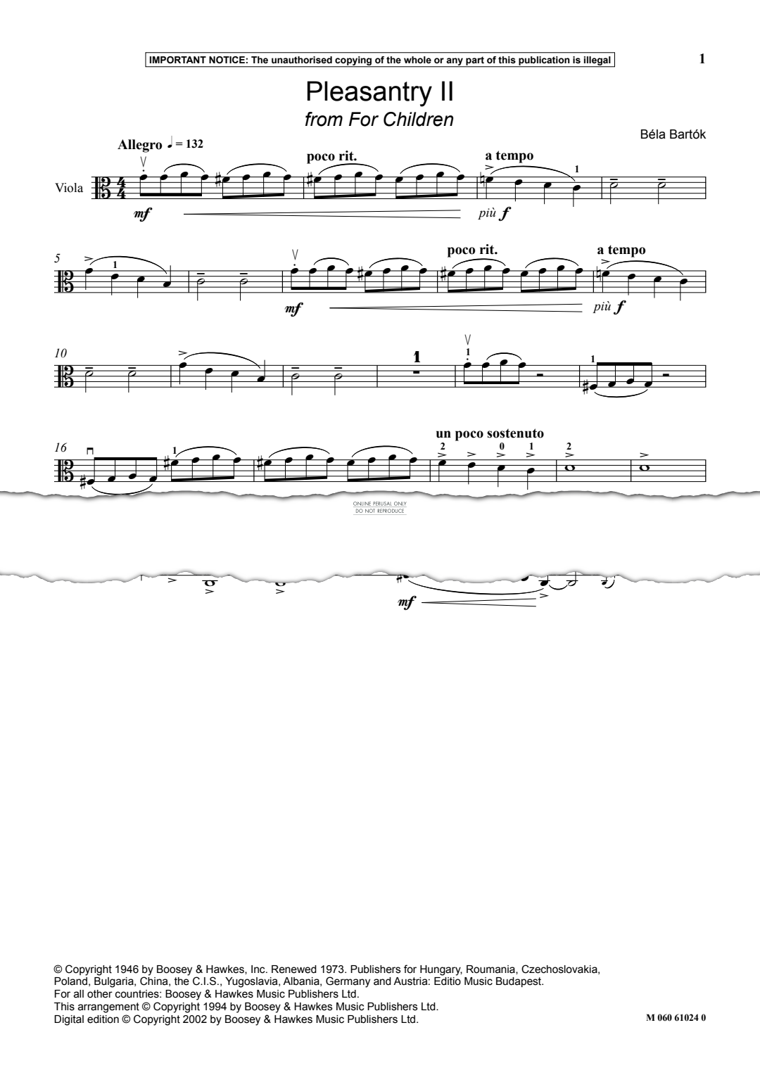 Pleasantry II from 'For Children' - Noten für Keyboard, Viola Bela Bartok