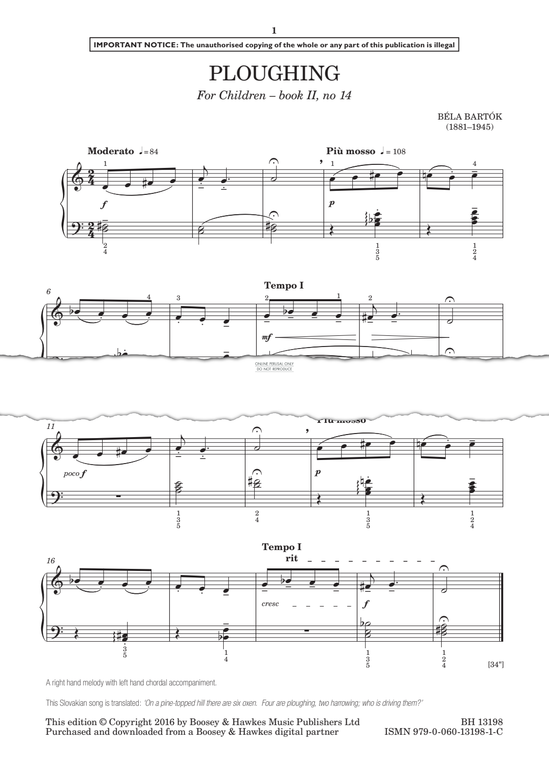 Ploughing (from For Children - Book II, No. 14) - Noten für Klavier Bela Bartok