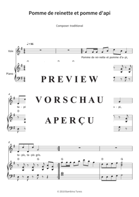 Dieses Werk enthält die Originalnoten des beliebten französischen Kinderlieds "Pomme de reinette et pomme d´api", einfach arrangiert in G-Dur für Klavier und Gesang.